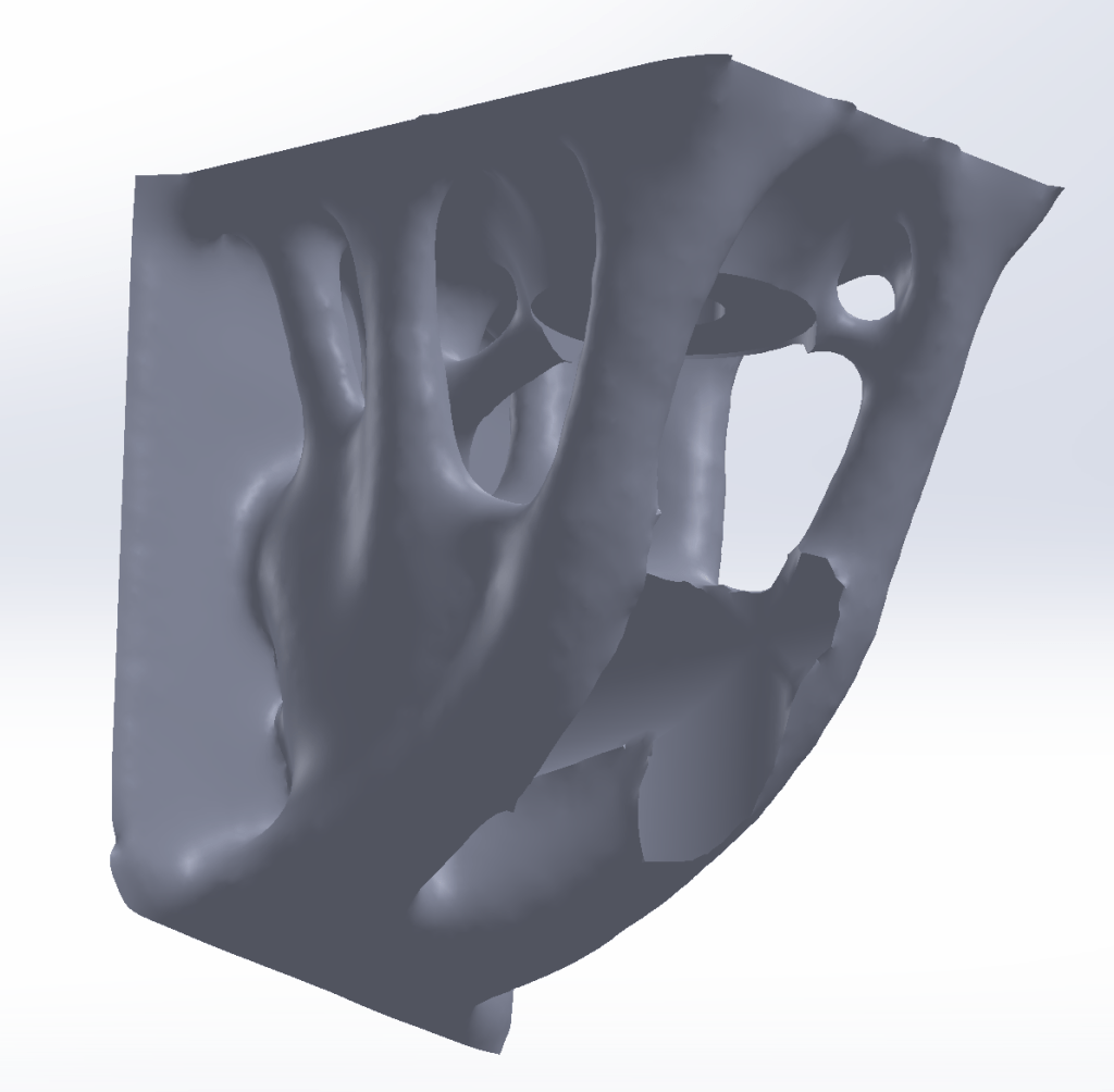 The important thing to know is that the optimization produces a field of densities, not a solid part. It’s very useful for feedback on an existing design, but you can’t extract a finished part directly. The reason for this is the design variables in the optimization are the densities of every element in a mesh. Most of these end up close to 0 (in empty space) or 1 (in the interior of the part), but on the boundary of the part they are near 0.5 and it’s not a particularly sharp cutoff. To get a 3d model you have to pick a threshold (for instance 0.5) and all material with density under that is removed, and all material with density over that is assumed to be completely solid. This is just an approximation to reality, you should not use the resulting parts directly.