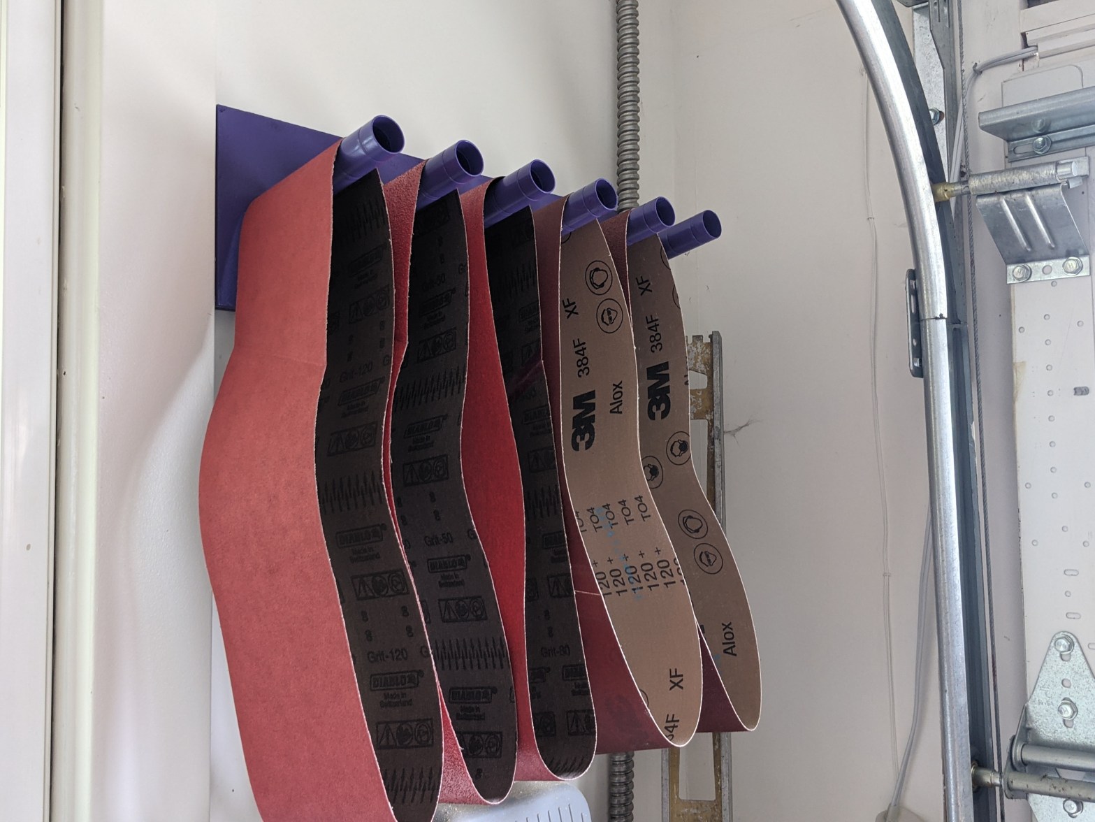 Quick and dirty project. Ikea wire shelves plus grinder plus plywood. The belts take up much less space now.